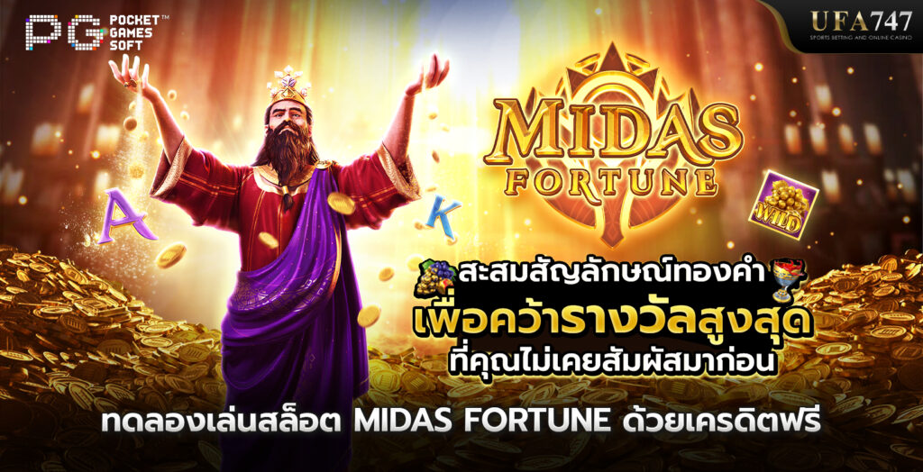 Midas Fortune เป็นเกมสล็อตแบบ 5 รีล 5 แถวแนวนอนจาก PG Slot ที่ได้รับความนิยมสูง กลไกของเกมเน้นฟีเจอร์ Midas Gold ซึ่งช่วยเปลี่ยนสัญลักษณ์ทองให้เป็นสัญลักษณ์ Wild เพิ่มโอกาสชนะต่อเนื่อง ค่า RTP อยู่ที่ 96.73% ความผันผวนระดับกลาง โอกาสได้รับเงินรางวัลสูงสุดถึง 5,000 เท่าของเงินเดิมพัน ฟีเจอร์หลักมีทั้งฟรีสปินที่เริ่มจากสัญลักษณ์ Scatter 3 ตัวขึ้นไป ให้รอบฟรีสปิน 8 ครั้ง พร้อมตัวคูณเงินรางวัลที่เพิ่มขึ้นเมื่อได้สัญลักษณ์ Wild ในชุดการชนะ